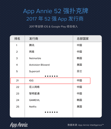 2017年App发行商排行,IGG是仅次于腾讯网易的中国厂商
