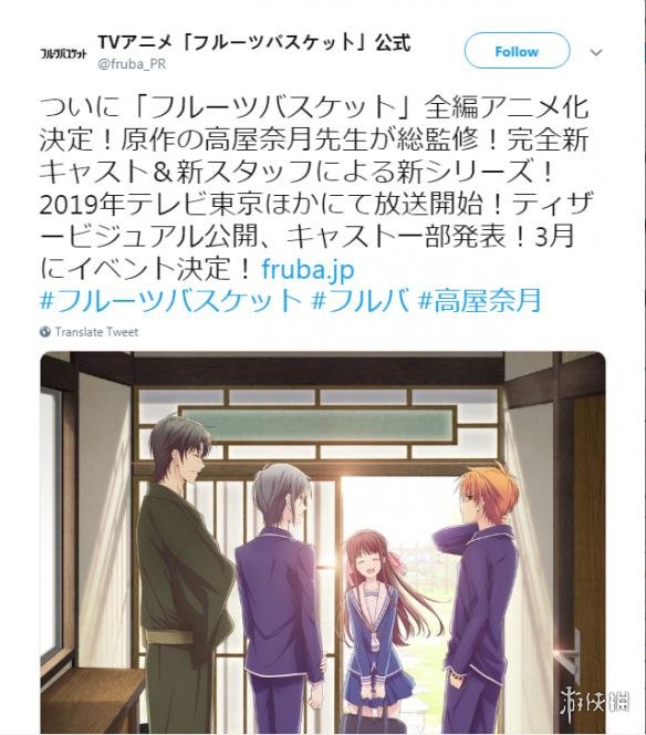 日本漫画家高屋奈月的经典漫画《水果篮子》的全新动画版制作官方宣布将于2019年正式开播,由高屋奈月亲自担当总监修。