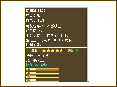 如果您想去克制哥不林洞里的怪物,推荐使用地水属性。这样地属性能够有效克制住蓝色仙人掌,而水属性就能够遏制住红蝎子的高攻击。 同样的,如果是去东海,该用哪种属性呢?其实还是地水最为合适哦!用水去克制魔法罐子,而用地去克制蓝影子。这样练级将会事半功倍,格外的轻松便捷。 而圣村遗迹调查中想有效克制狮子和地狱妖犬则需要使用风地的属性。而在湿气洞穴内,想克制住花妖,需要使用火风的属性才行哟! 前面说到,想拥有属性,必须将碎片镶嵌在装备上,通过使用装备才能拥有属性。那怎样将碎片镶嵌在装备上呢?这就要让装备师帮忙了。当装备师学习了该装备制作技能的同时,也拥有了该装备装饰的技能。可以通过装饰技能,将水晶碎片镶嵌进装备内。 需要注意的是:R1的装备每镶嵌一点属性,需要一块水晶碎片;而R2的装备每镶嵌一点属性则需要2块碎片才行哦,R3,R4依此类推。。。而一件装备最多拥有10点属性。也就是说人物可以通过在2件装备上镶嵌属性而拥有超越宠物的20点双属性。 |