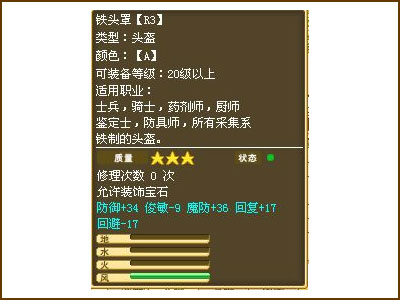 属性装备的合理利用(通过属性装备的巧妙搭配,在战斗中事半功倍(推荐练级点以及属性装备混搭) 前面已经说了在不同的练级点,因为怪物的属性各不相同,所以也就需要不同的属性来针对怪物来进行克制。这里给大家推荐一个属性使用的小窍门哦! 因为发现不少玩家习惯将属性镶嵌在武器和身体部位的防具上。而通常这2样装备都是常用装备,一般都是装备目前可使用的最高级。所以一般只用一套在身上,那人物本身的属性也就有了一定的局限性。而且在高等级的装备上镶嵌属性,所需要的碎片也再不段增加,消耗也是不少。所以在一般练级的情况下,不少聪明的玩家都喜欢在鞋子和帽子上镶嵌属性哦! 而这样的属性搭配丝毫不弱于在武器上镶嵌属性(事实证明,碎片镶嵌在哪都是一样的)。然而由于在练级过程中,玩家们一般对于帽子,鞋子的要求不会过高,而如果选择R1的鞋子,帽子做为镶嵌属性的装备,一方面可以节约装备开销的成本,一方面也可以节约修理费用,NPC修理R1装备仅仅需要60G。更可以大大的减少碎片需要的支出。毕竟R1装备只需要10个碎片就能将属性装满,而R2,R3每次都需要太多的碎片。 |