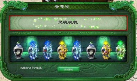 玩家打开“青花资”后,进入“青花瓷”小游戏。每局游戏开始前,8个“青花瓷”中所有“宝物”将全部展示给您,其中包括“未鉴定的装备盒”、各等级“魂魄石”等超值大礼!玩家选择“开始游戏”,8个瓶子将不再显示宝物,并随机交换位置。您可以随意选择其中的3个“青花瓷”做为奖励!