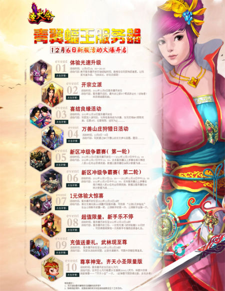 《武林秘籍》新资料片“圣火令”开启了新的武侠之旅。在玩家的支持与鼓励下,游戏连开新服,“青翼蝠王”也是官方重金打造的全新服务器,在开启的同时玩家将会得到意外的惊喜福利,还有刺激的各类冲级赛,奖励不断。等级、个人和家族冲级赛,两轮新区争霸赛,超值限量新手好礼以及充值1元惊喜礼包,趣味十足还有机会获得极品宝宝的狩猎活动都会让玩家重新体验到《武林秘籍》!