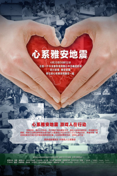 4月20日,雅安芦山县发生地震,随后经过一天的筹备,由蓝港CEO、热酷CEO、全球移动游戏联盟秘书长、哆可梦创始人寇汉组成的先锋队带上31家全国各地游戏公司的慰问和赈灾物资于21日奔赴雅安灾区,这个4人救援团代表的是全国各地游戏公司。游戏人团结一致,在此刻,我们都是雅安人!挺住,同胞!