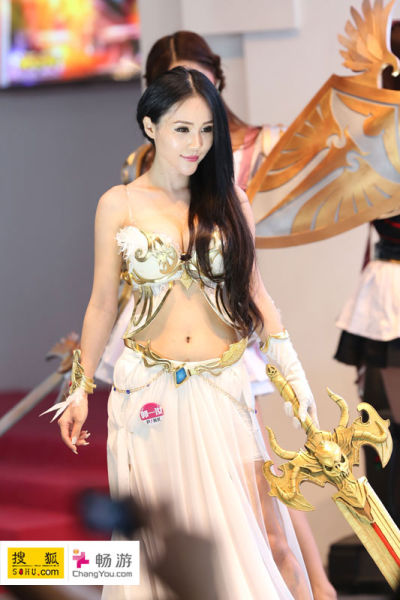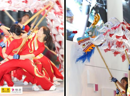 同时,搜狐畅游展台现场舞起了大龙,现场气氛顿时更加喜庆热闹,畅游展台的showgirl们亦是神采奕奕,笑容甜美,引无数玩家争相拍照合影。