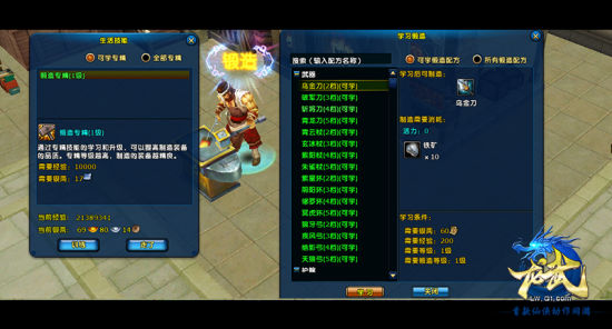 玩家在角色建立后,便可以锻造最低级的武器,锻造材料可通过野外杀怪、参加活动、副本和击杀BOSS等渠道收集,也可找其他玩家交易获得。锻造武器与制作装备时一样,会出现失败的情况,玩家可找长安生活技能区的锻造导师提高专精等级。
