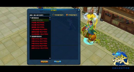 炼丹技能,《龙武》里依然是人人都会,最初的时候都只能炼最低级的止血丹。当玩家通过采药技能挖取或者与玩家交易获得足够的草药材料时,可开始炼丹。玩家炼丹依然会存在失败的可能,学习专精则提高成功几率。当炼丹技能熟练度槽变满时,玩家就需要找长安炼丹导师学习下一级炼丹技能。炼丹技能升级后,玩家可在炼丹大师处学习相应的炼丹配方。