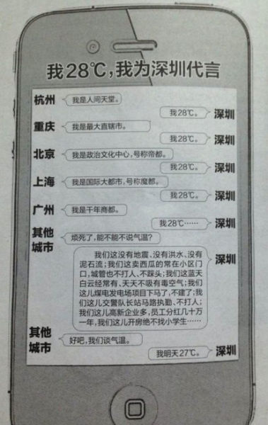 自盛夏以来,全国进入烧烤模式,上海、北京、浙江等地气温高达40°以上,据说,一盘冰冻五花肉,贴在上海的马路上,15分钟就熟透了,然而,深圳的气温却一直保持在28°左右,坚决不与全国接轨,比起雨神萧龙王更显牛逼。网上甚至出现了一段爆笑神对话,参见下图。