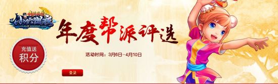 帮派评选活动《武林外传·小六巡夜》帮派争霸年度评选活动时间为3月6日14:00——4月10日14:00,只需上传自己的帮派全家福即可参与活动,每个帮派只可参与一次。各位武林英雄们可以为自己喜欢的帮派投上宝贵的一票,帮派前三名会有无上的光荣展示、专属的特殊称号道具和帮派建设基金奖励!