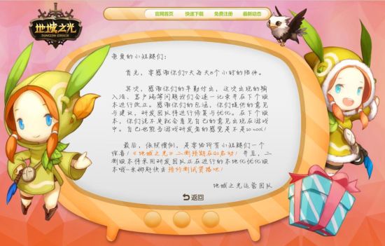 感谢信另外,也要感谢所有玩家的辛勤付出,玩家提供的意见与建议,官方会专门整理提供给研发团队进行内容修复与优化。在下个版本,玩家也许就可以看到自己提出的想法得以在游戏中真正实现了。在首测期间的通过官网活动反馈BUG的玩家,还有机会获得二测资格哦!