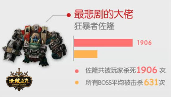 虽然作为游戏第一个出场的BOSS,但狂暴者佐隆在7天一共56小时的时间里被玩家推倒了1906次!也就是说平均每个小时34次,差不多两分钟就被推倒一次……人家好歹也是一介威武雄壮的套马汉纸,你们为何口味如此之重?!不过佐隆作为一个BOSS,如此高频的被KO率,实在是太悲催了吧,忍不住掬一把辛酸泪。