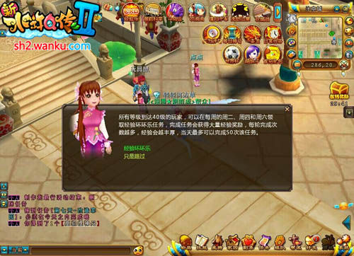 经验环环乐活动《新水浒Q传2》无固定模式的跑环活动,以10个任务为完成一成套环为基准,任务的内容由寻人、寻物以及战斗等多种形式随机组合而成,趣味性十足,避免玩家在枯燥的任务中耗费大量时间与精力,且每一环完成后可获得一定量的经验奖励。当接取到无法完成的任务时,比如无法找到的物品,可放弃任务,放弃任务后当前轮次数清零,并且需要等待5分钟才能再次接取任务。