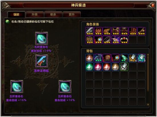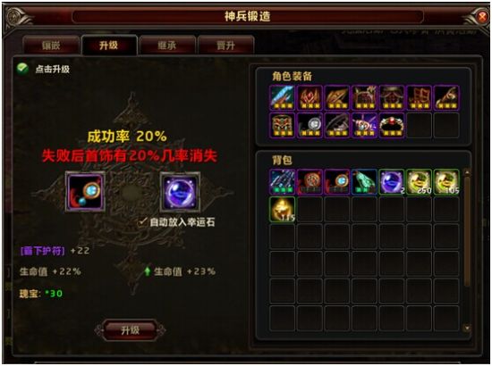 镶嵌装备升级,让角色属性值再次暴涨。武器可以升级至60级!随着装备升级,成功率也随之下降,这时候就要用道具“幸运石”来提升成功率。需要注意的是,升级首饰还需要道具“瑰宝”,该道具可在商城中购买。如果装备升级失败,装备就会消失!想要成功,是一定要冒风险的,往往极品就是在他人不敢再继续强化时,由您一锤定音!