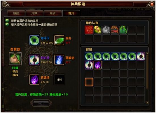 升级法宝晋升,可将法宝品相改变,从蓝色的下品法宝晋升至橙色的神品法宝!其中中品、上品为紫色品质,极品、仙品、神品为橙色品质。每次法宝晋升都会提升法宝基础资质属性,不影响法宝附加技能、附加资质,进化资质,进化阶段等。