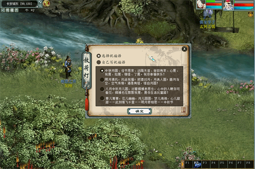 诸位玩家可前往长安城东(87,122)找到吴刚购买荷灯,随后在长安城东(95,121)附近放置,可在荷灯上写下自己的中秋祝福,也可点击别人放的荷灯,回送祝福。