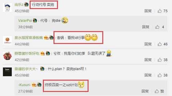 果然UZI计划真的很可怕,ban小狗然后其他队友有的选了,针对UZI,然后其他队友有的爽了。。。小明表示,微笑的面对一切,针对UZI的计划,我看行!甚至有网友脑补出了Mlxg和队友们的对话——看我ID行事(mlxg=卖了小狗)。