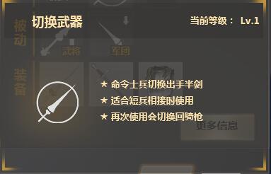 使用该技能后全军切换半手剑,该武器适合在短兵相接的时候使用,再次使用该技能将切换回骑枪。