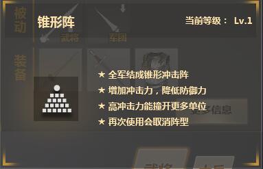 全军结成锥形冲击阵,从而获得更高的冲击力,能够撞开更多的单位,但是会大幅降低防御力,再次使用该技能将取消锥形阵。