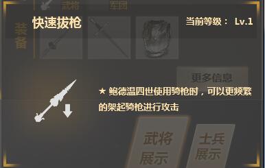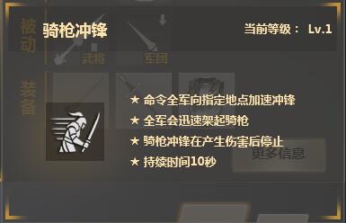 命令全军向指定目标地点加速冲锋,冲锋时全军会迅速架起骑枪,当产生伤害后骑枪冲锋会自动停止,该技能持续时间为10秒。