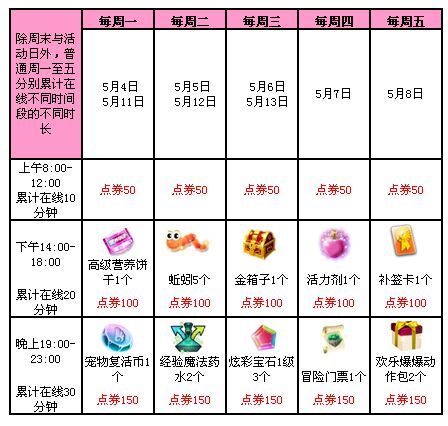 周一至五分别累计在线不同时间段的不同时长达到要求,可获得点券、宠物用品、热门道具等奖励。每天300点券来就送!