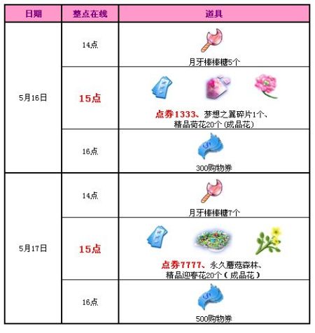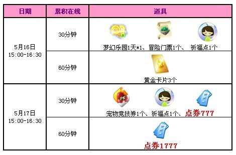 5月16日至5月17日期间,每天14-16点累计在线30分钟可分别获得热门道具与祈福点。5月17日活动期间累计在线30分钟可以获得777点券,累计在线60分钟可以获得1777点券哦!