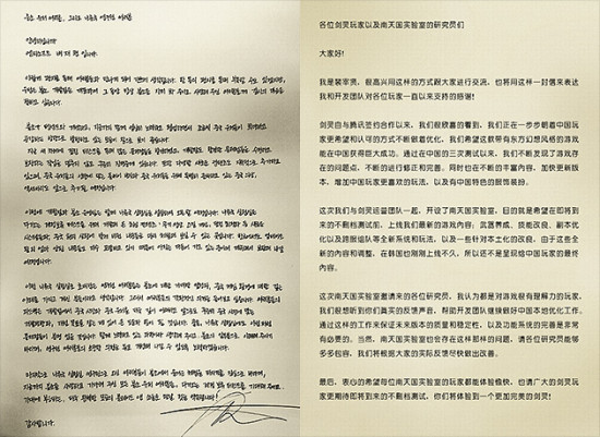 在信中裴制作代表整个开发团队表达了对中国玩家的感谢,同时也对南天国实验室的效果寄予厚望,并承诺将会让灵芝们体验到更完美的剑灵。