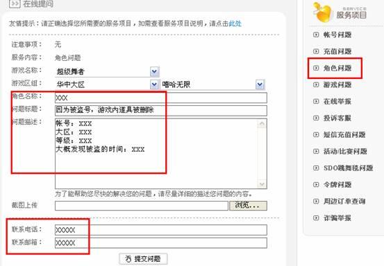 (3)在服务项目中选择角色问题,填写好问题提交。