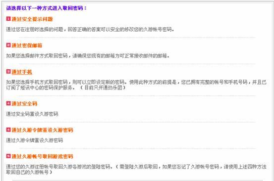 方法二:玩家通过安全码等帐号信息自助修改游戏密码。地址:password.9you.com/password_retake.jsp
