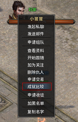1、点选要进行比较的玩家,在鼠标右键弹出的下拉菜单中选择“成就比较”,弹出比较界面。