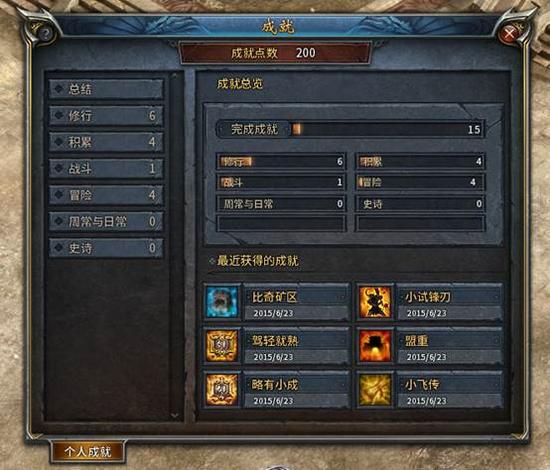 成就按照不同的内容分为“总结”“修行”“积累”“战斗”“冒险”“史诗”等分类。
