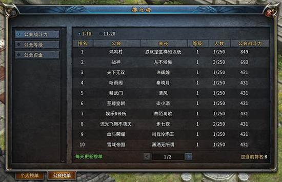 公会榜单分为3个子榜单,分别为:“公会等级”、“公会战斗力”、“公会资金”。