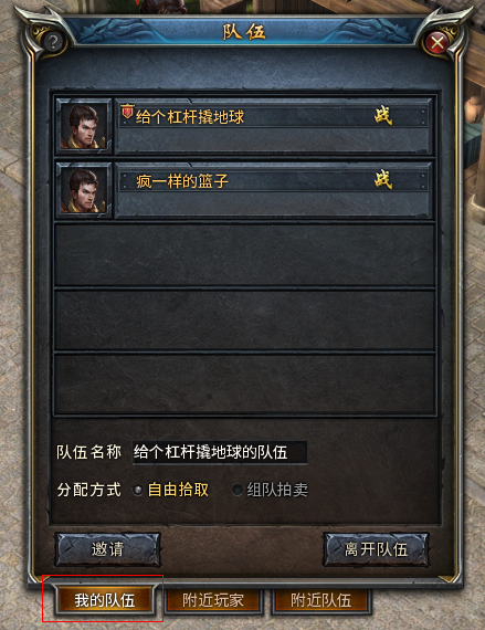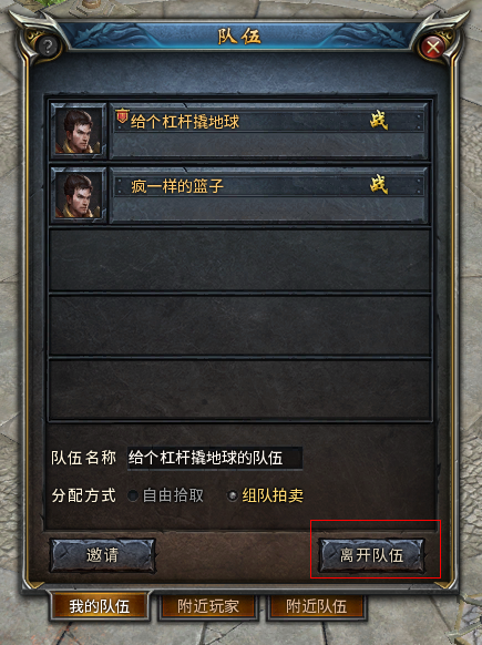 1)点击我的队伍界面的“离开队伍”按钮。