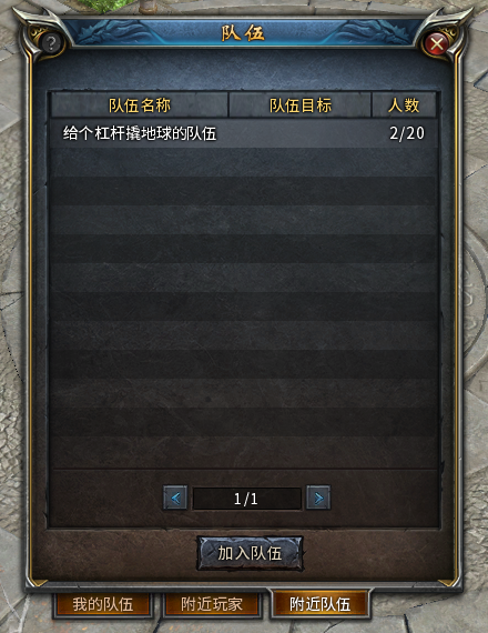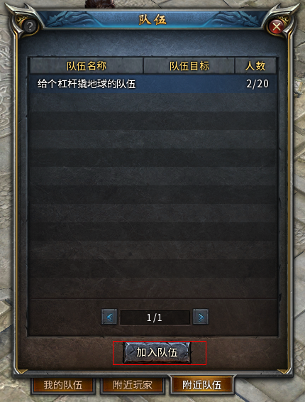 2)打开队伍界面,在“附近队伍”面板里选择目标队伍,再点击“加入队伍”按钮,对方在收到系统提醒通过申请后,就成功加入队伍了。