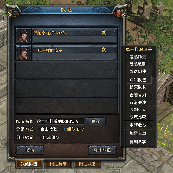 1)在屏幕左边的队伍列表里选择目标,右键弹出选项,选择“踢出队伍”;