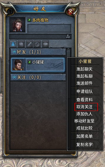 1)在好友列表里,找到对方头像,鼠标右击,在弹出的列表里选择取消关注