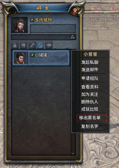 鼠标右键选择需要移出黑名单的玩家,在弹出的选项中选择“移出黑名单”,就能完成操作。