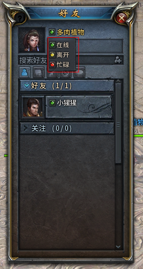 点击角色头像旁边的绿色小点,可选择自己的角色状态,目前有三种状态:“在线”,“离开”,“忙碌”。