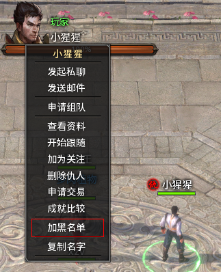 选中玩家头像,鼠标右键点击,选择“加黑名单”,就可将对方加入黑名单。