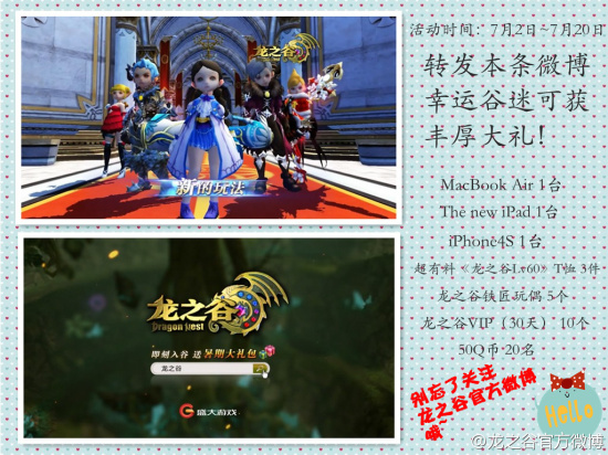 配合《龙之谷》TV广告秀,龙之谷官方微博、官方论坛以及各大媒体多重活动火爆进行中,参与活动,就有机会获得俗称“苹果三件套”的MacBook Air、The new iPad、iPhone4S,以及实物周边、虚拟道具等海量奖品!
