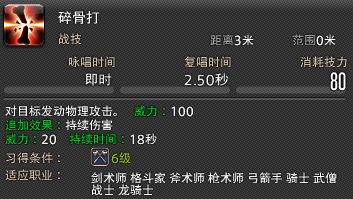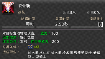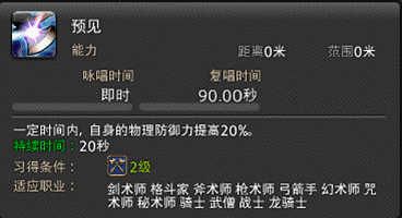 点评:由于龙骑士的晋升职业副职业是要求斧术士(战士)达到15级,所以15级前的职业技能你都应该已经学会。这是一个练级/低级fate不错的防御技能,由于他只加物理防御,raid的时候几乎没有物理伤害的必中aoe,价值很低。
