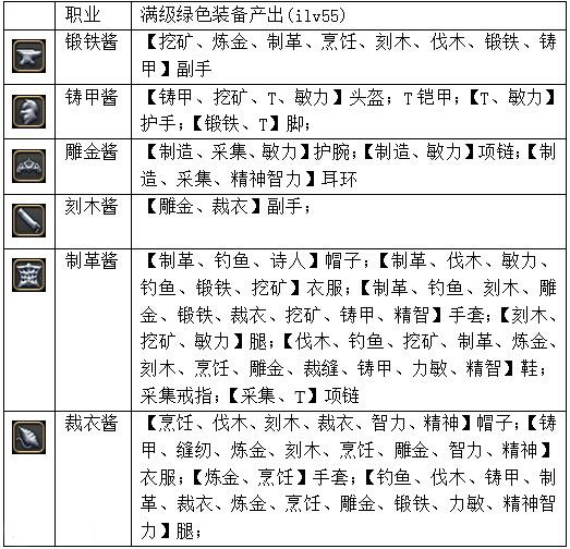 5. 表中列出了主要的原材料和各种产出,不过不绝对,每个职业基本上可以用到其他所有职业的产出,只是有的量比较少,楼主是一边看着配方表一边感觉什么用的比较多来写出来的。有的职业会有少量的其他装备产出。