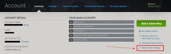 在战网管理的首页,在右侧一栏里,最下方的一条选项是“Beta Profile Setting”,点击它。