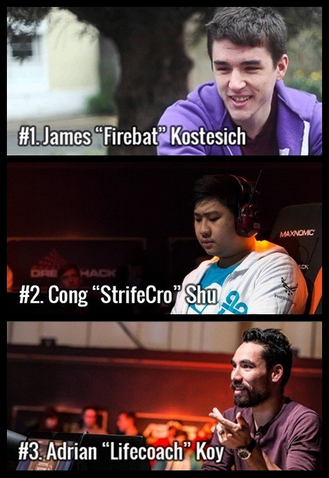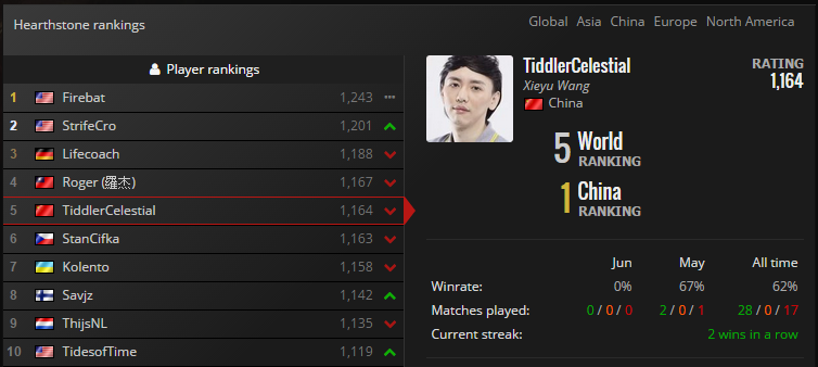 直至发文为止炉石传说赛事积分世界排名前三位的选手分别为Firebat、StrifeCro、Lifecoach(比赛积分会持续变化)。而各位非常熟悉的小鱼鱼大仙人(TiddlerCelestial)则排在第五位,著名的K神(Kolento)则状态下滑排在第七位。