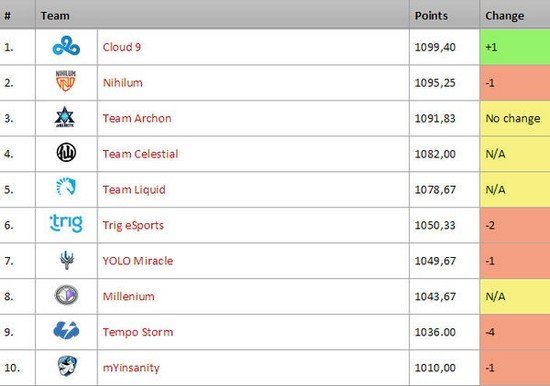 而战队积分排名榜中,排在积分榜首位的是K神Kolento以及StrifeCro等人所在的Cloud 9战队。第二位是Lifecoach及Rdu等人所在的Nihilum战队,而第三位则是Firebat、Amaz等人所在的Archon战队。
