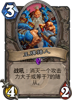 然后砰砰博士几乎在所有牌组中流行了起来,游戏环境中有足够多的7+攻击随从,王牌猎人便成为了所有非快攻牌组,甚至某些快攻牌组的标准配置。我现在所建议的是,满编王牌猎人可能会成为新的游戏环境中的必需。在以前带上一张是为了适应游戏环境。现在来说你带上一张是标准动作,而再带一张是为了要更好适应游戏环境。随着比赛中出现了越来越多针对奴隶战的手牌术,有的动物园术也带上了砰砰博士和玛尔甘尼斯,王牌猎人的春天正在降临。