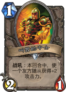 这又是一张在打脸猎和动物园一类的快攻牌组中已经非常常见的牌。然而,像Xixo的恶魔术这样的牌组给我们展示了即使在节奏较慢的牌组中叫嚣的中士依旧有很强大的潜力。每套卡组都总有那么几个攻击力稍低的随从,只要+2攻击力就可以换掉一些较大型的随从。进一步来说,在牌组中带上1个(或者2个)王牌猎人,你往往能打出组合,给对手的洛欧塞布或者索瑞森大帝加上2点攻击力使其进入王牌猎人的射程范围。世界上一些最顶尖的快攻牌组玩家往往都会将叫嚣的中士留在手牌,即使手上没有1费站场,也不冒险地把他简单作为一个1费2/1体质随从打出,因为如果你能够发挥出他的全部潜力,他的价值会非常之高。