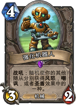 还有什么套牌的随从能够比手牌术更加强大的呢?如果你曾使用过8/8身材带有风怒或者圣盾的随从,你就不会再想在牌组中错过强化机器人了,如果能让一到两个随从获得嘲讽,这也不比阿古斯防御者差了多少。因此,实际上强化机器人就是第二个略差的阿古斯防御者,但拥有很强大的发挥潜力。之所以说是第二个阿古斯防御者,是因为牌组中需要有2个日怒防御者和1个阿古斯防御者,才能有足够的嘲讽让你在猎人或者其他快攻牌组的攻击下生存下去。