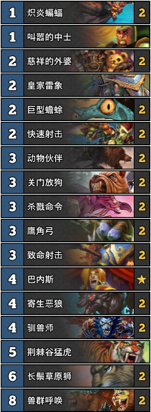 卡组点评:狼外婆优化了猎人的二费曲线,而巴内斯如果可以拉出狮子,饿狼,狼外婆这样的单卡瞬间强化了我方的场面。夭寿啦,按费拍怪的猎人4费下狮子啦!