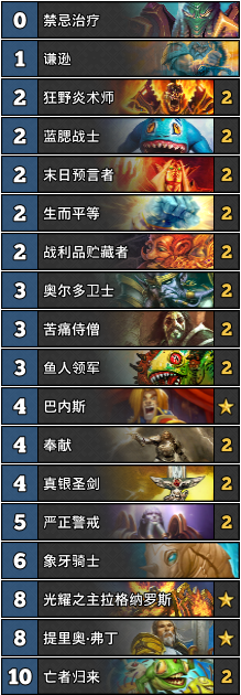 卡组点评:巴内斯给鱼人骑的帮助也不小,光罗斯和弗丁自不用说,只要多拉出一只鱼人,给亡者归来的收益则是大大提升~