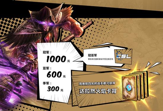 同时,宿舍英雄周赛冠亚军将获得晋级高校星联赛(CSL)城市预选赛的资格,这也是晋级高校星联赛《炉石传说》项目的唯一途径!你可以在这里了解到更多关于高校星联赛的信息。