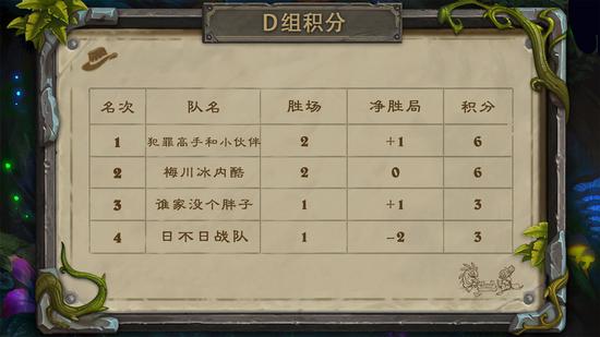 经过前几轮的比赛,四支队伍的战绩均为1胜1负,接下来的比赛将决定最后的出线名额。第一回合,“犯罪高手”的萨满 面对“日不日”战队的土豪法师,败在一连套华丽的法术之下,最终“日不日”成功施展了无限火球术拿下了这局。第二回合“日不日”的猎人在开局低费随从卡手的情况下,无法对“犯罪高手”的德鲁伊造成威胁,被扳回一局。第三回合是一场猎人内战,“犯罪高手”更胜一筹拿下了比赛。第四回合,双方你来我往一直打到牌空,最终“日不日”战队的骑士先输于疲劳,“犯罪高手”赢得了这场比赛,也顺利晋级。